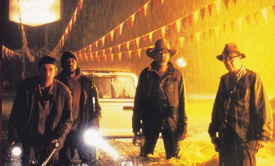 その効果は、ディザースター映画の序章としてふさわしく、間断なく降り続く大雨は、ミシシッピー川流域に位置するインディアナ州ハンティングバークの街を、いまにも飲み込もうとしている。家屋浸水の被害で、街は極限状態の緊張感がただよう。保安官のマイク(ランディ・クエイド)は、町の治安と避難を受け持つ責任者として、辣腕をふるっていた。閑散とした町の酒場では、リーダー格のジム(モーガン・フリーマン)を中心に現金輸送車襲撃の計画を練っていた。準備は万端、残すは計画通り実行するのみ。しかし、計画通りに進まないのが悪巧み。そこには2ヶ月前にセキュリティーポリスとなったばかりの青年トム(クリスチャン・スレーター)が輸送車の護衛していた。