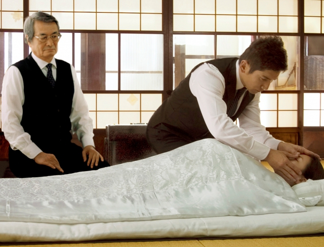 最後のクレジットでは、死体役を押し付けられたDVDの撮影から時が過ぎ、一人前になって納棺の儀を執り行えるようになった本木雅弘の一連の動作を完了することで映画は幕を閉じる。監督の滝田洋二郎は、最後に脚本を最大限に生かすべく映画の様式美を静と動、死と生をひとつの画面にまとめることに成功している。